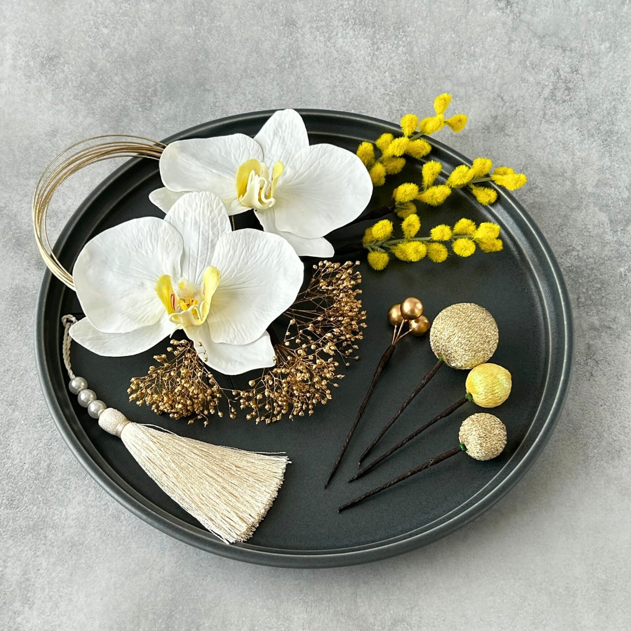 髪飾り 胡蝶蘭 ミモザ 成人式用 卒業式 結婚式 水引 和装 袴 振袖 着物 白無垢 色打掛 ヘア飾り KA-2502