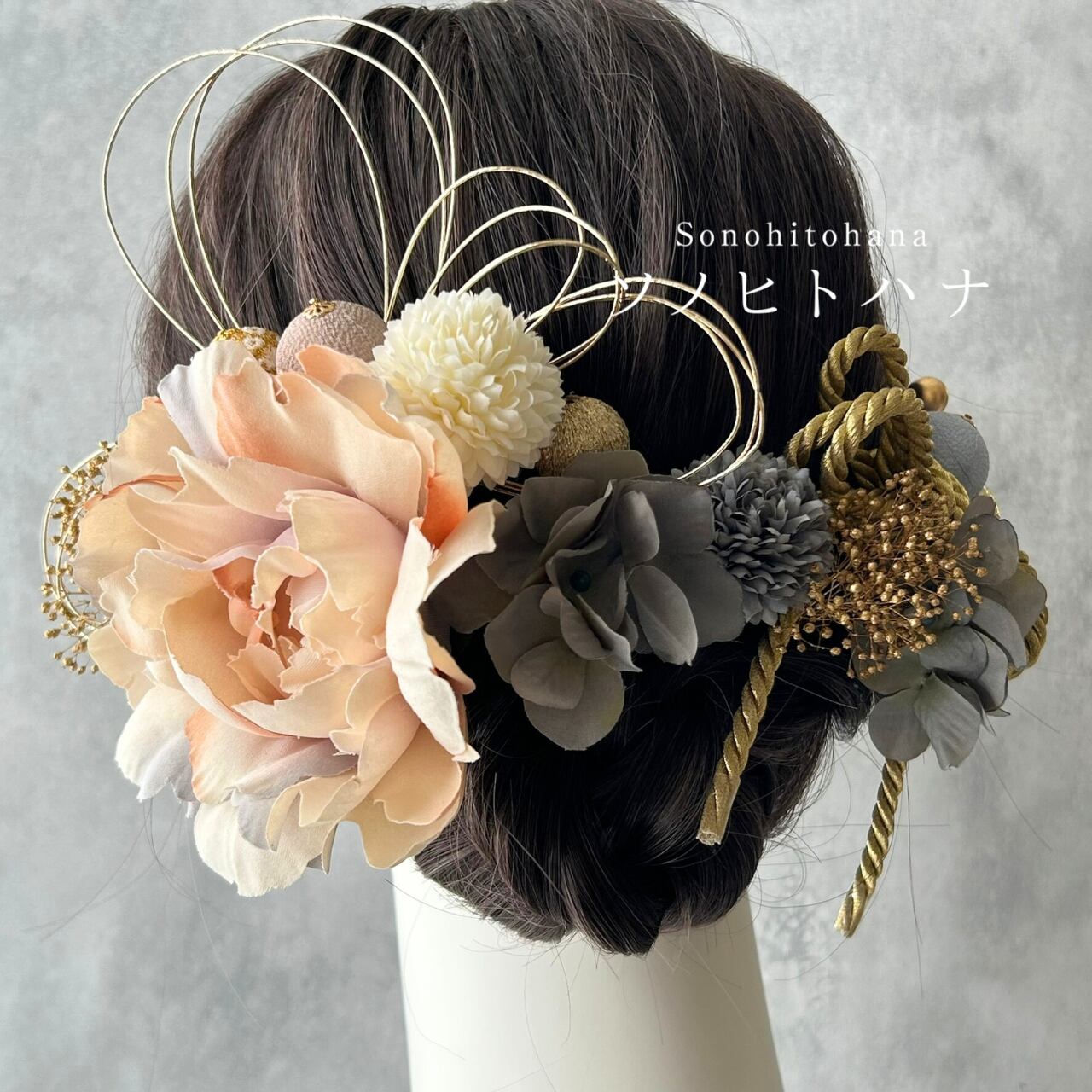 髪飾り ヘッドドレス ヘッドパーツ ヘッドピース ヘアアクセサリー ヘア飾り ヘアード ヘアパーツ 花飾り 大きい花 卒業式 成人式 七五三 前撮り 結婚式 ウエディング ブライダル パーティー お呼ばれ 大きめ 振袖 袴 和装 着物 浴衣 和風 白無垢 打掛 色打掛 造花 アーティフィシャルフラワー アートフラワー 花 金箔 水引 ゴールド 金 くすみカラー ドライフラワー クリーム色 グレー 淡色女子 くすみカラー