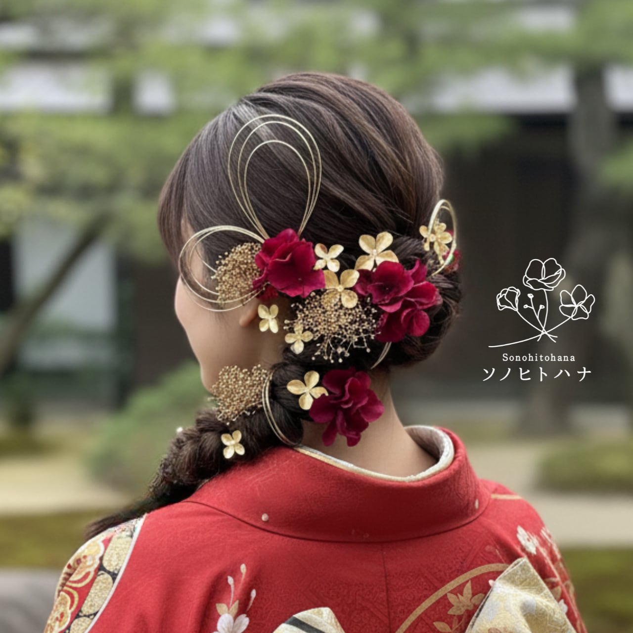 髪飾り 編みおろし ヘッドドレス ヘッドパーツ ヘッドピース ヘアアクセサリー ヘア飾り ヘアード ヘアパーツ 花飾り 卒業式 成人式用 花嫁 成人式用 七五三 前撮り 結婚式 ウエディング ブライダル 振袖 袴 和装 着物 浴衣 和風 白無垢 色打掛 打掛 洋風 造花 アーティフィシャルフラワー アートフラワー 花 金箔 水引 タッセル ゴールド 金 赤 赤系 レッド ドライフラワー
