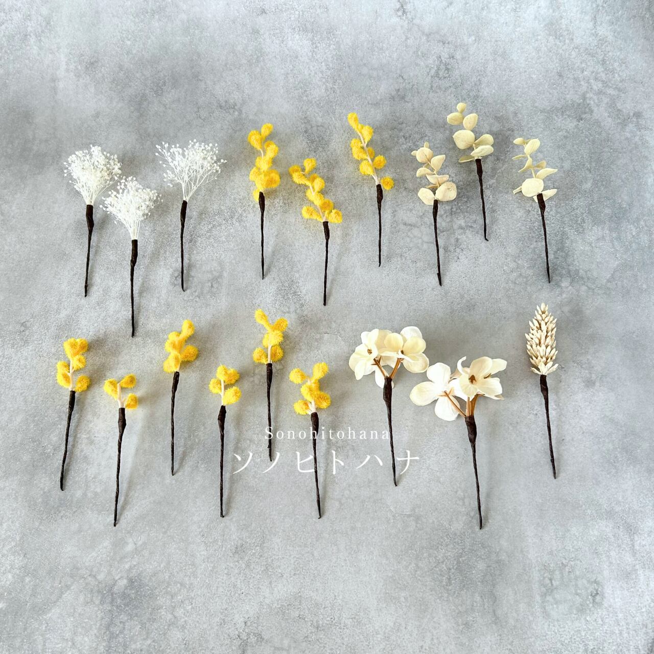 ドライフラワーのような風合いを楽しめる、くすみカラーのミモザ髪飾り。