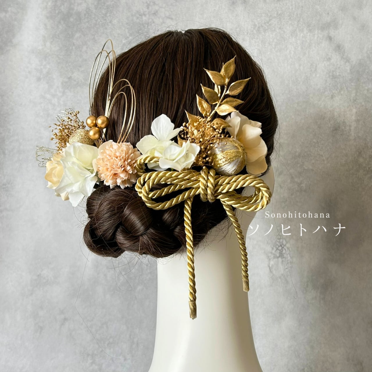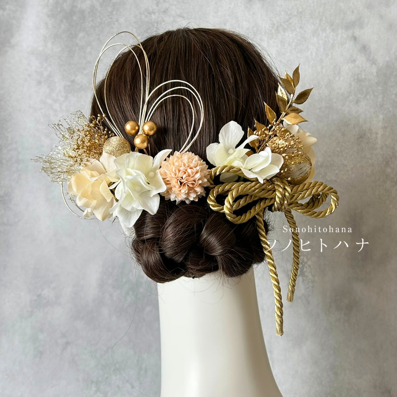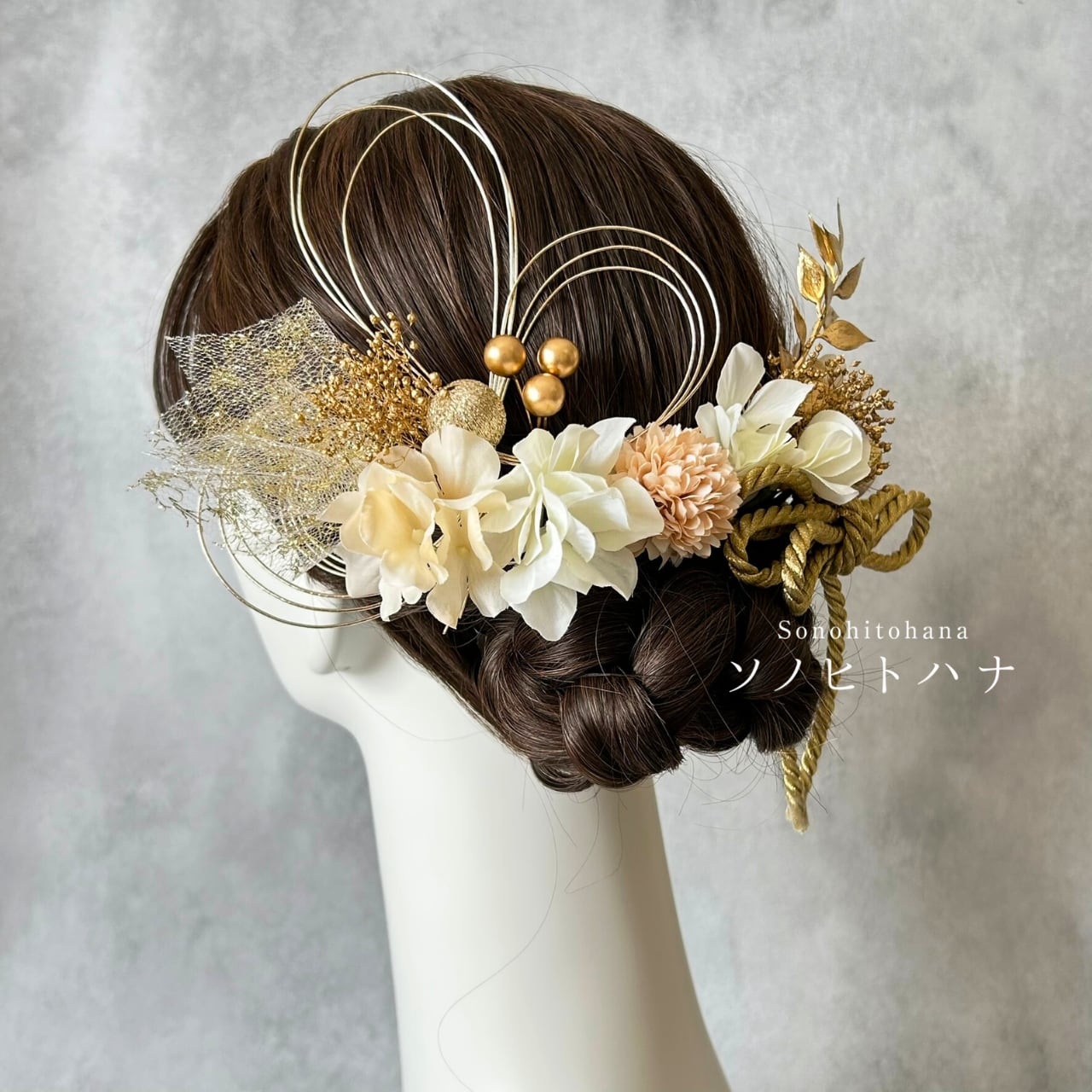 白×ベージュのあじさいと和紐の髪飾り ゴールド|成人式・卒業式・結婚式・前撮りに|紐アレンジ チュール|和装ヘアアクセサリー KA-2604W
