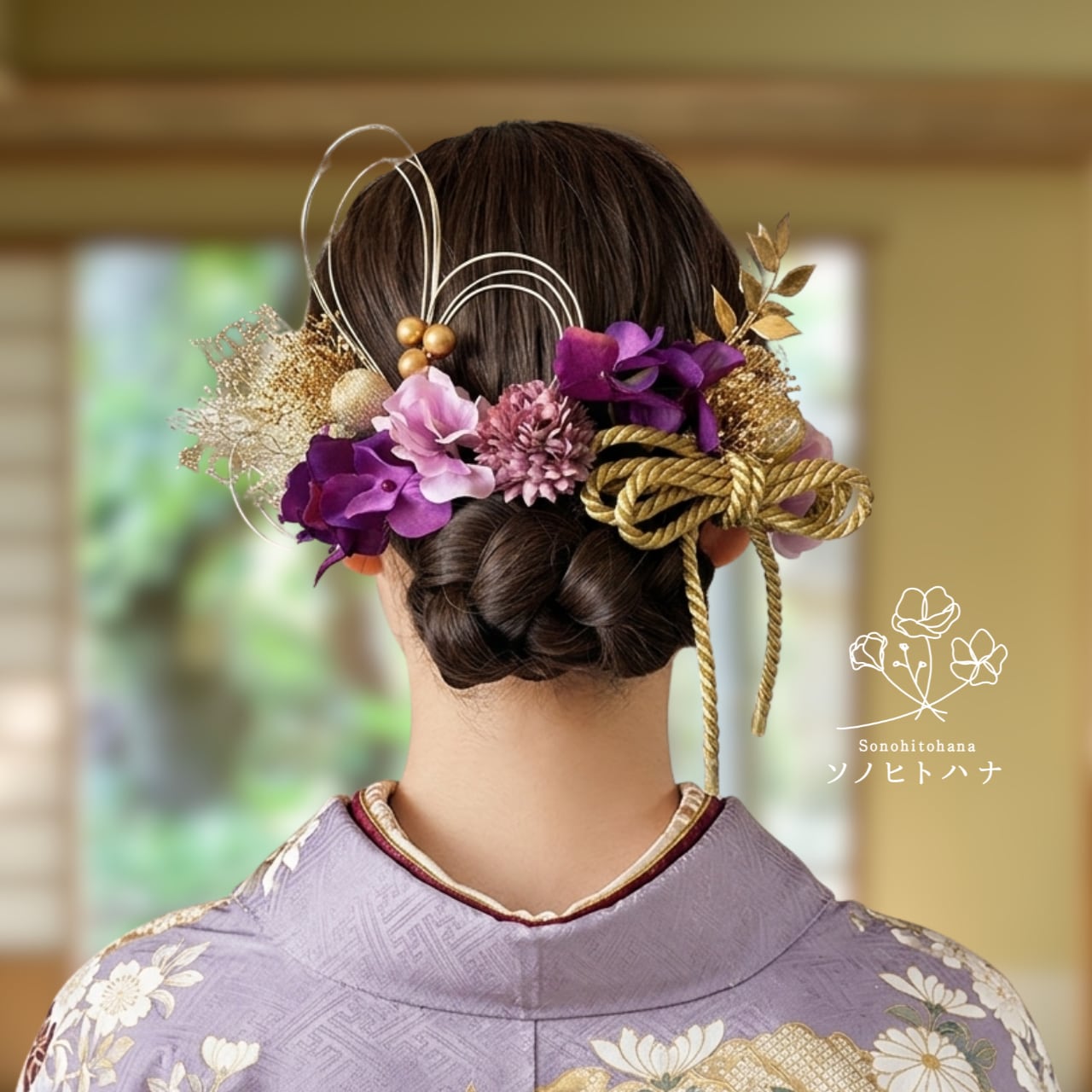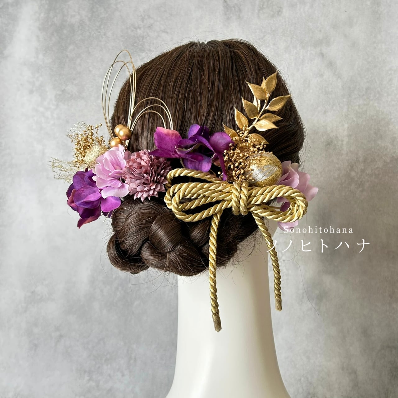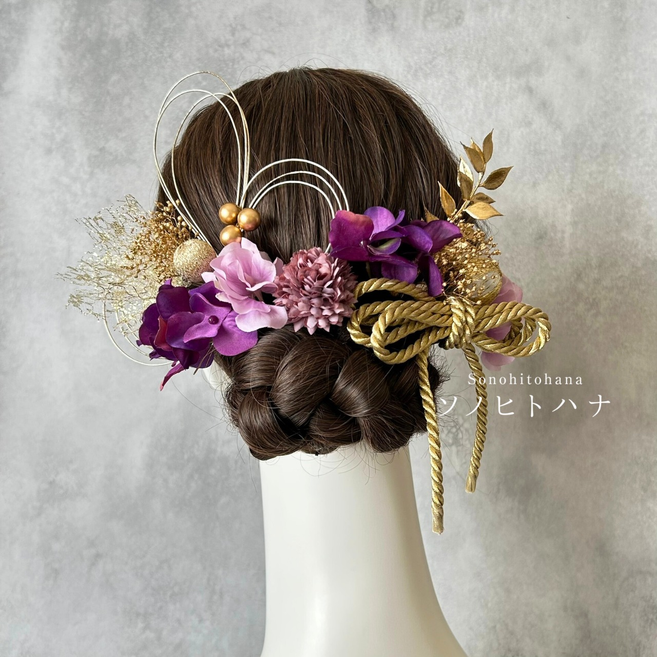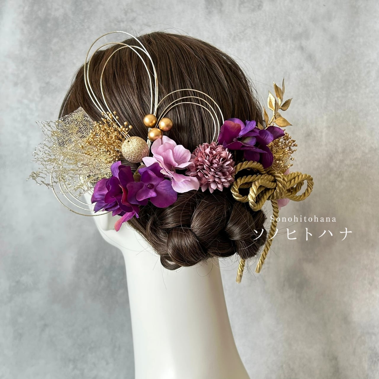 紫×薄紫のあじさいと和紐の髪飾り ゴールド|成人式・卒業式・結婚式・前撮りに|紐アレンジ チュール|和装ヘアアクセサリー KA-2604PU
