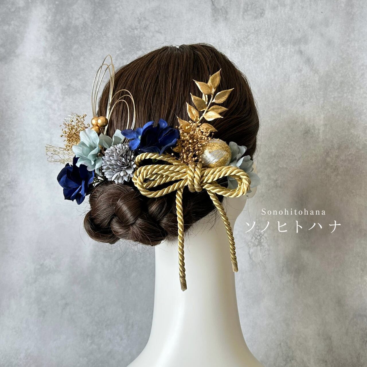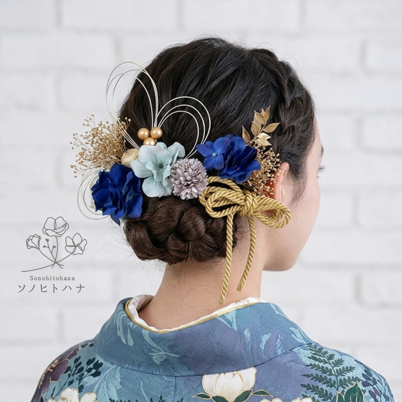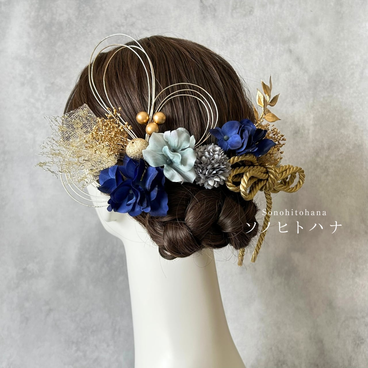 青×水色のあじさいと和紐の髪飾り ゴールド|成人式・卒業式・結婚式・前撮りに|紐アレンジ チュール|和装ヘアアクセサリー KA-2604B