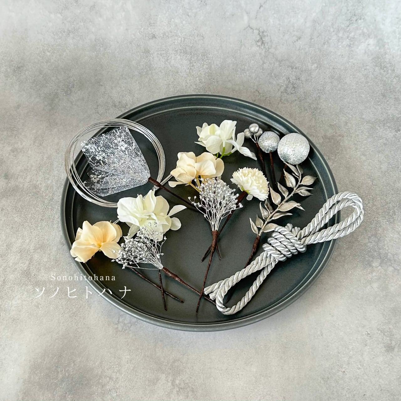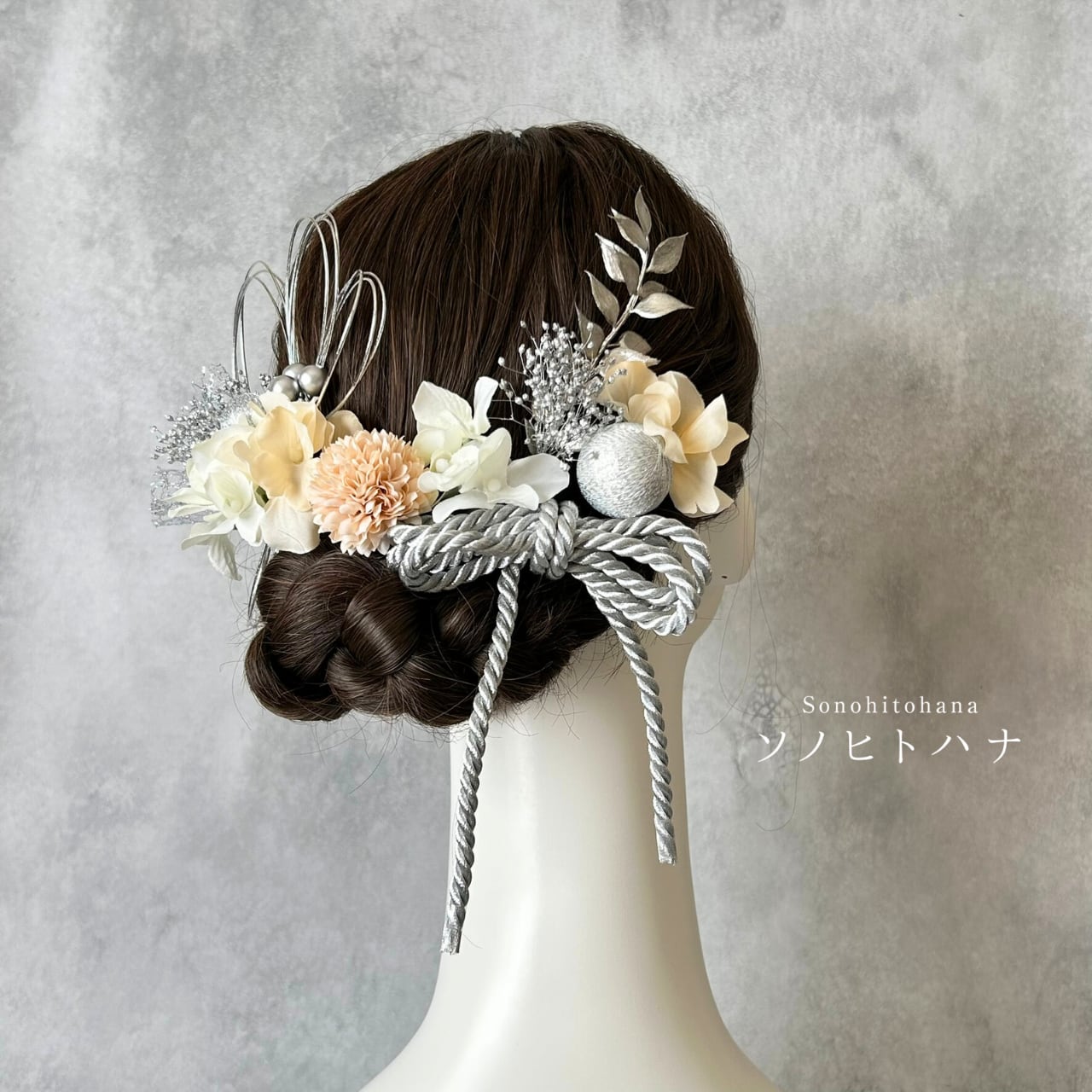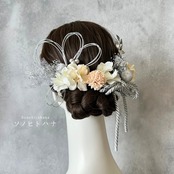和紐や水引、チュールなどのパーツをシルバーで統一した髪飾り。