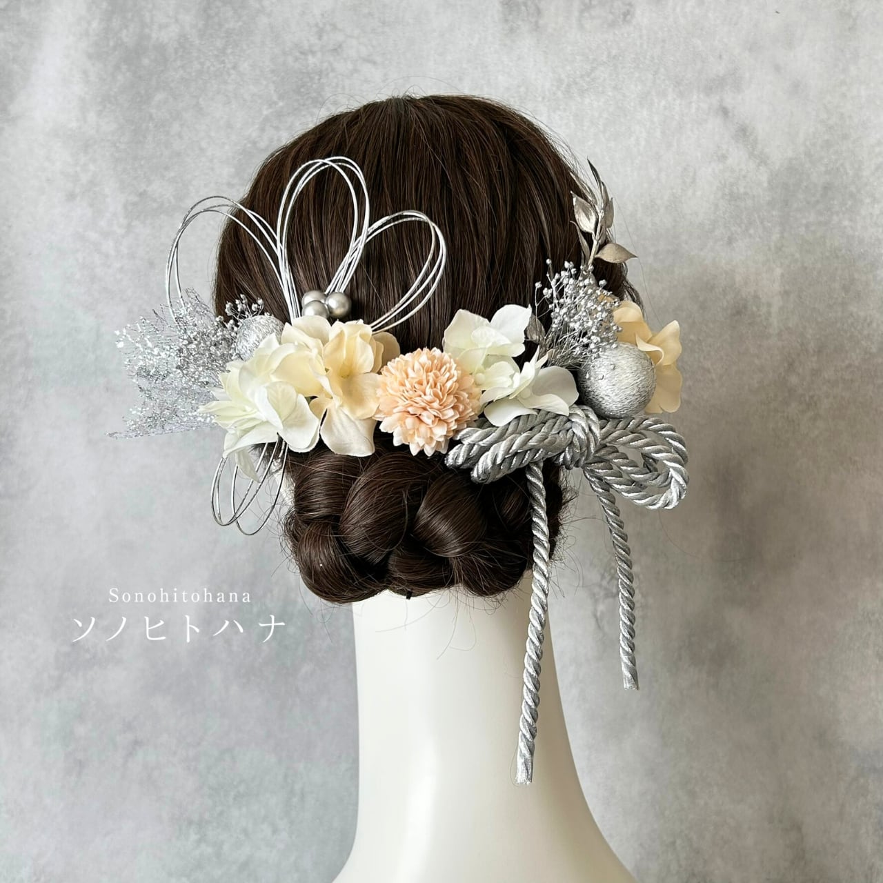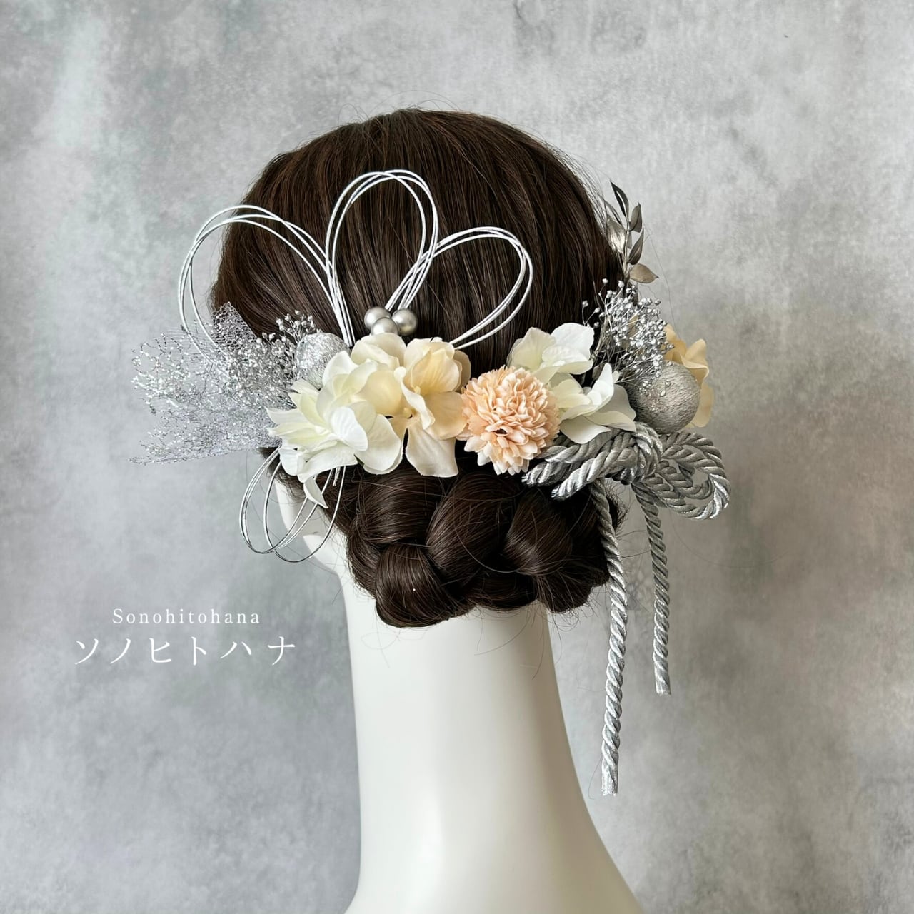 白×ベージュのあじさいと和紐の髪飾り シルバー|成人式・卒業式・結婚式・前撮りに|紐アレンジ チュール|和装ヘアアクセサリー KA-2605W