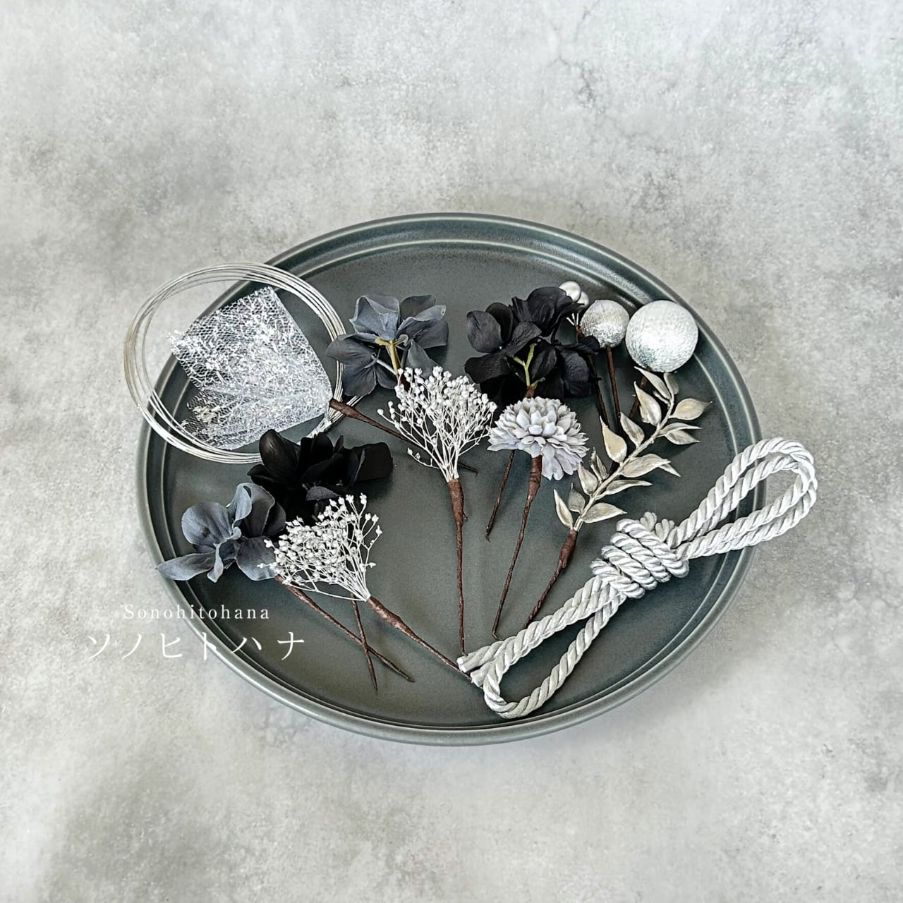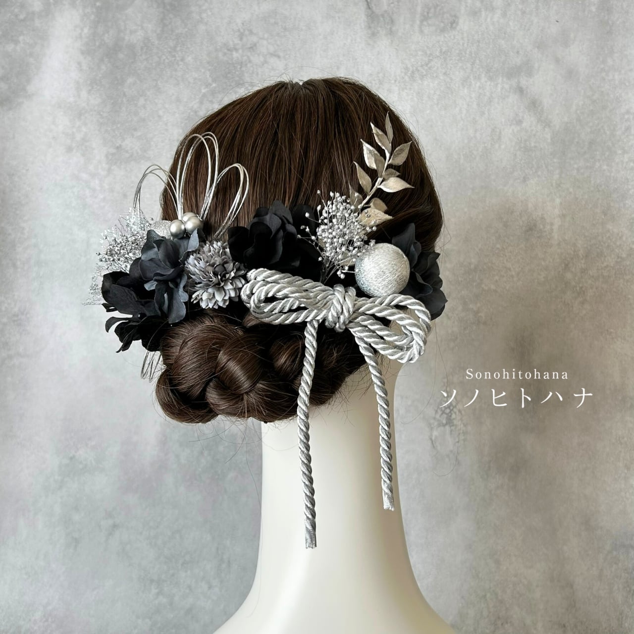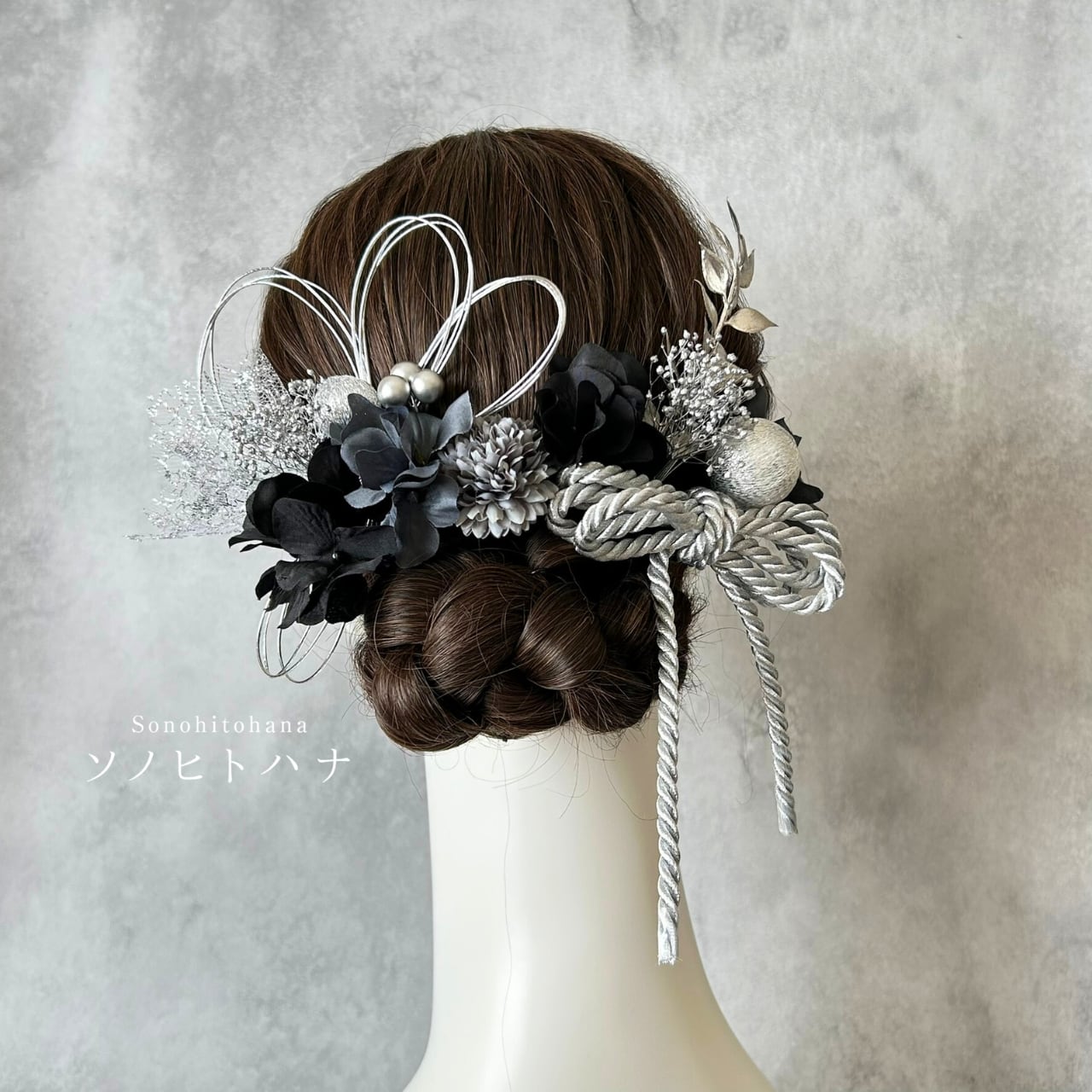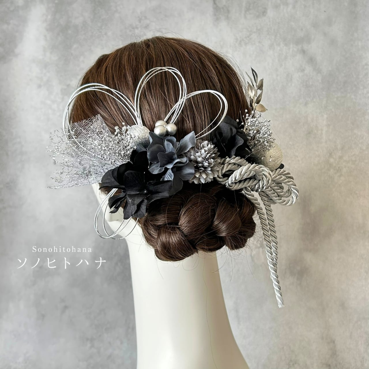 黒×グレーのあじさいと和紐の髪飾り シルバー|成人式・卒業式・結婚式・前撮りに|紐アレンジ チュール|和装ヘアアクセサリー KA-2605BL