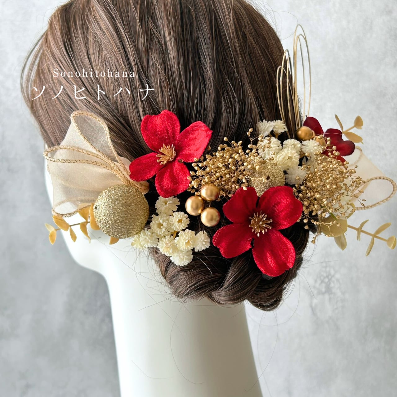 髪飾り 成人式 卒業式 結婚式 和装 袴 振袖 着物 白無垢 レッド ゴールド くすみカラー KA-2406R