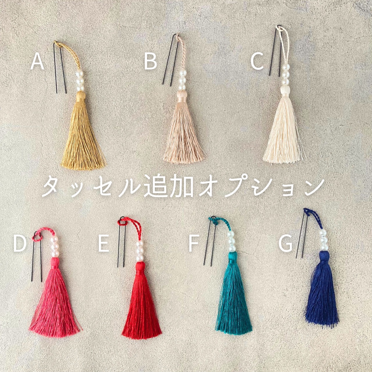 今風のくすみカラーでまとめた髪飾りはトレンド感たっぷり、